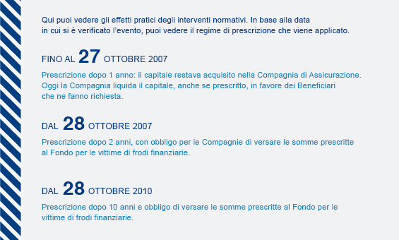 Una volta decorso il termine di prescrizione, le Compagnie di Assicurazione sono obbligate a versare le somme non riscosse dai Beneficiari al Fondo costituito presso il Ministero dell'Economia e delle Finanze, destinato a risarcire i risparmiatori vittime di frodi finanziarie.